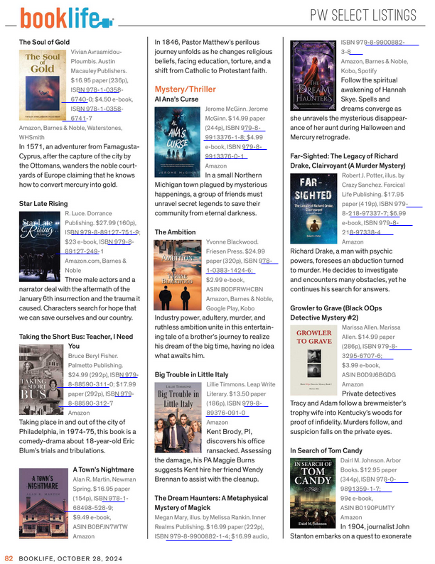 I submitted my debut novel, The Dream Haunters: A Metaphysical Mystery of Magick, Book 1 of the Witches of Maple Hollow Trilogy in June 2024 for the Book Life Prize Mystery/Thriller genre.The tagline of which is Discover the Key. Open the Portal. Save our Legacy.